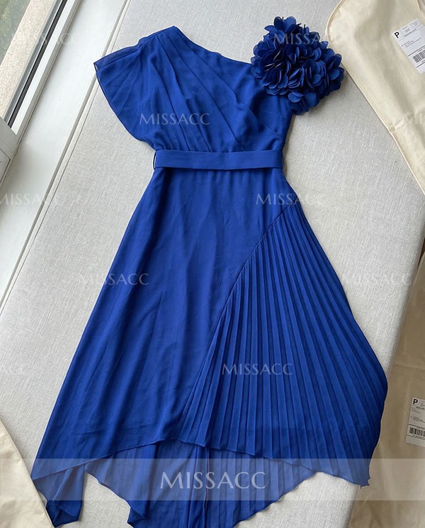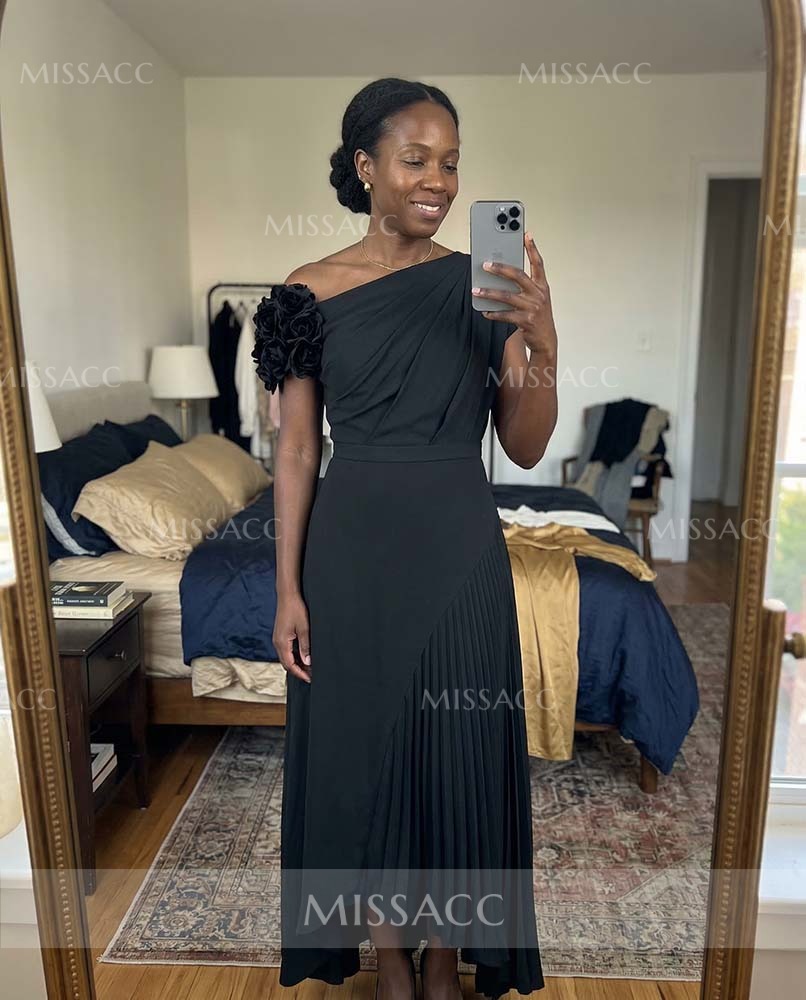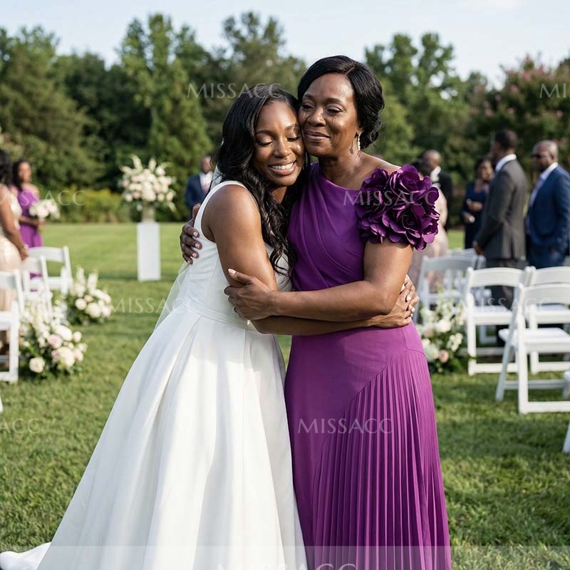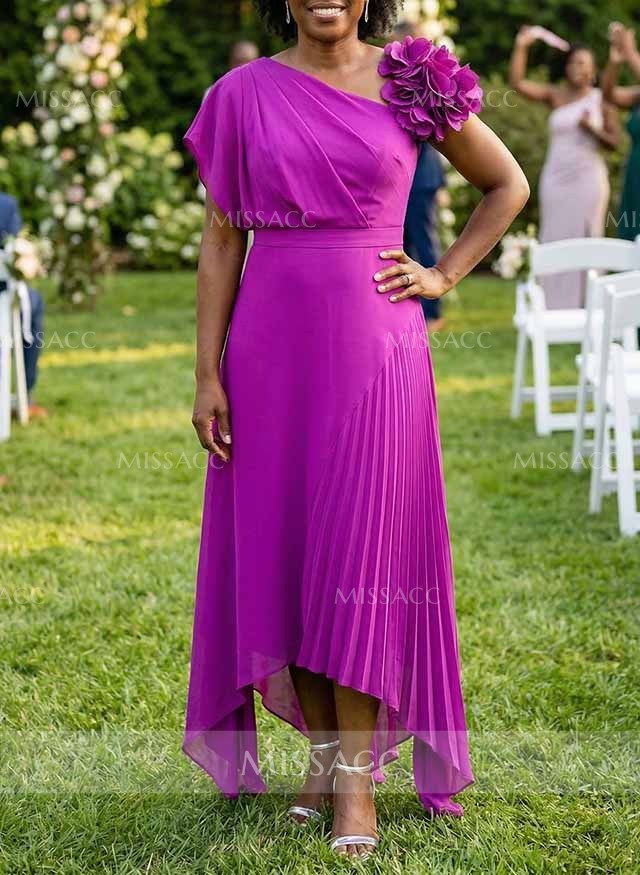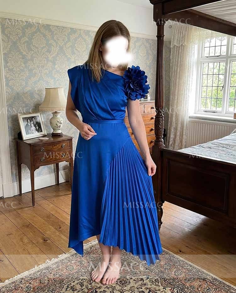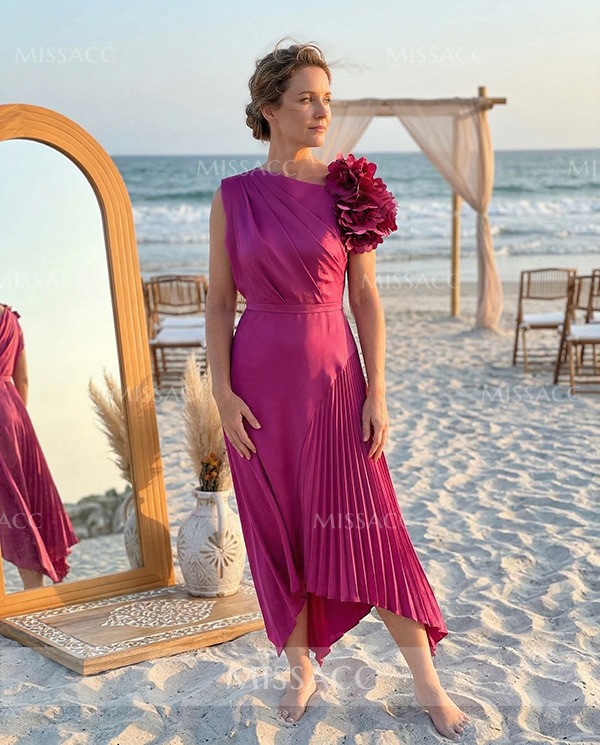 Discover our A-line asymmetrical satin mother of the bride dress, featuring a pleated flower detail for a chic and sophisticated look perfect for weddings.