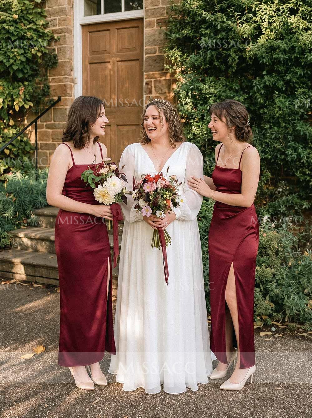A-Line Asymmetrical Sleeveless Floor-Length Satin Bridesmaid Dresses With Bow(s)/High Split #SBD11615