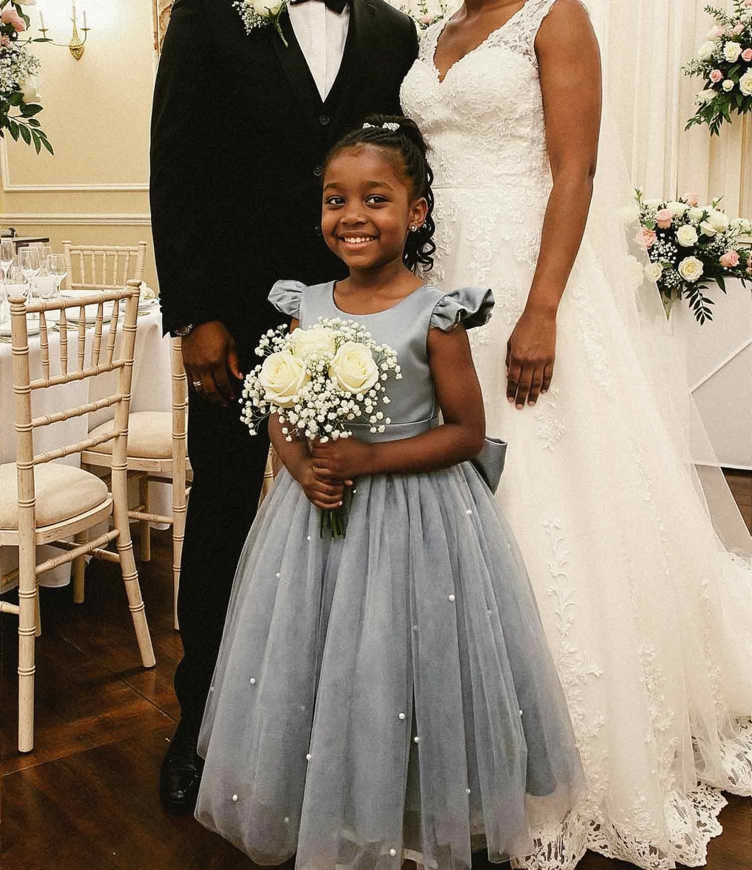 A-line Lace Tulle Flower Girl Dress, featuring a chic scoop neck and knee-length silhouette, perfect for weddings and special events.