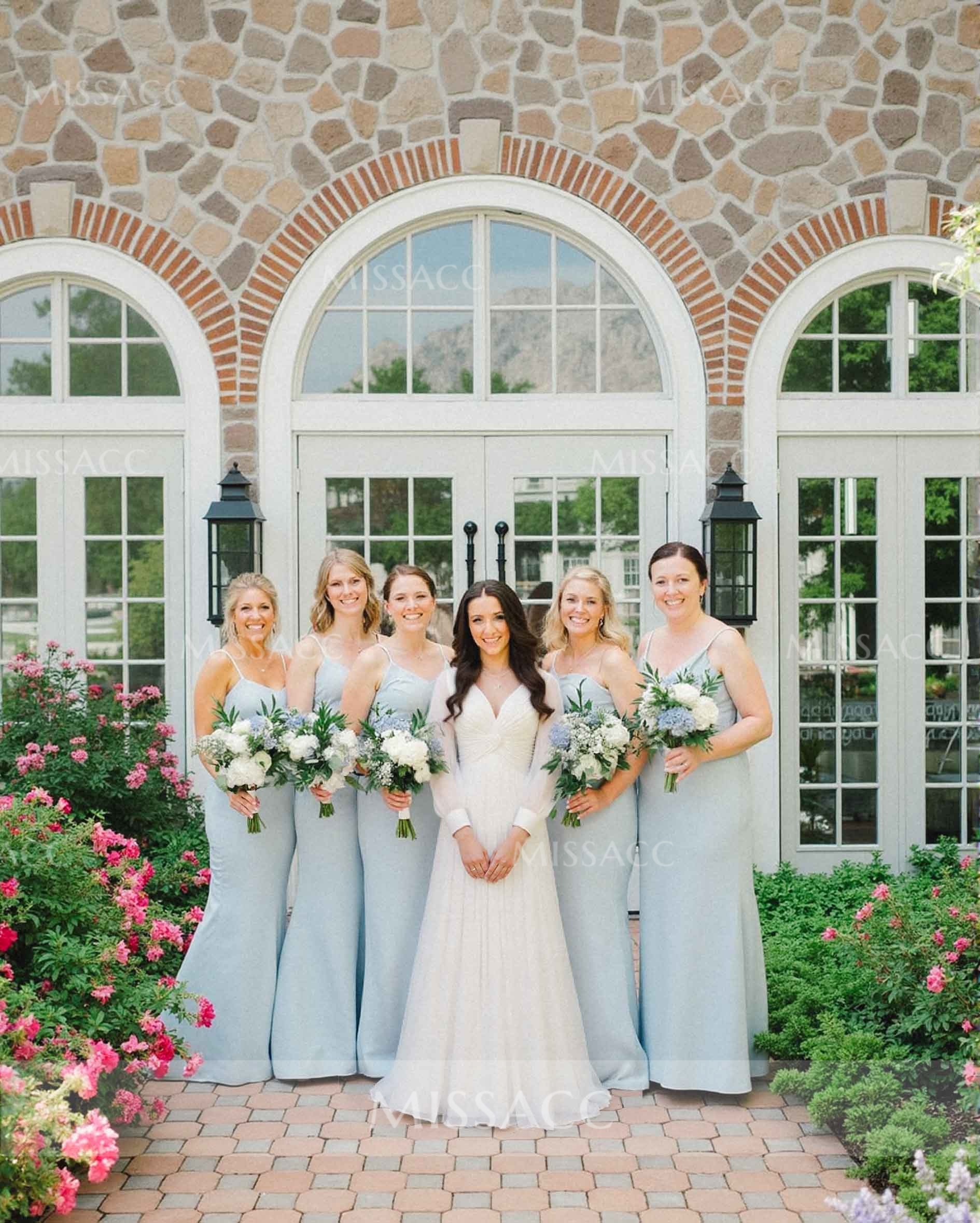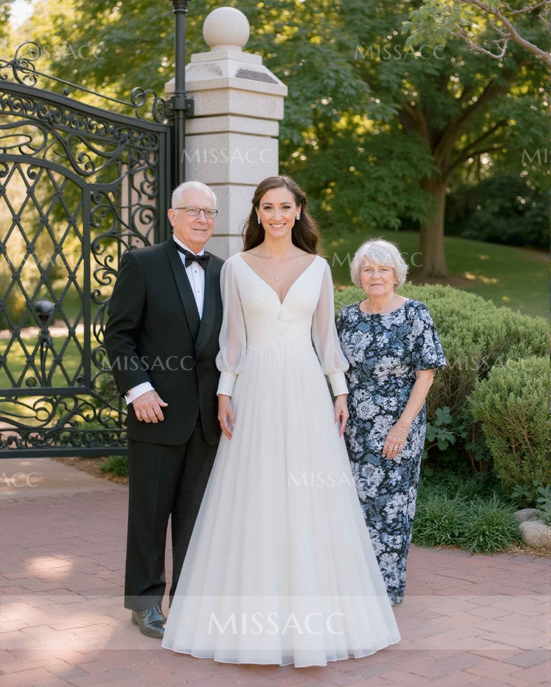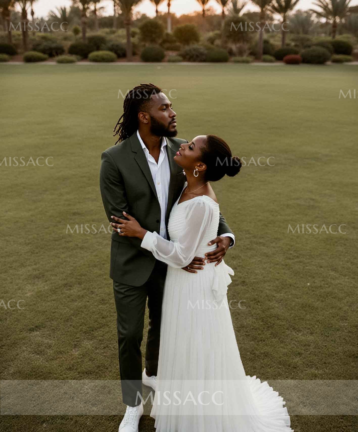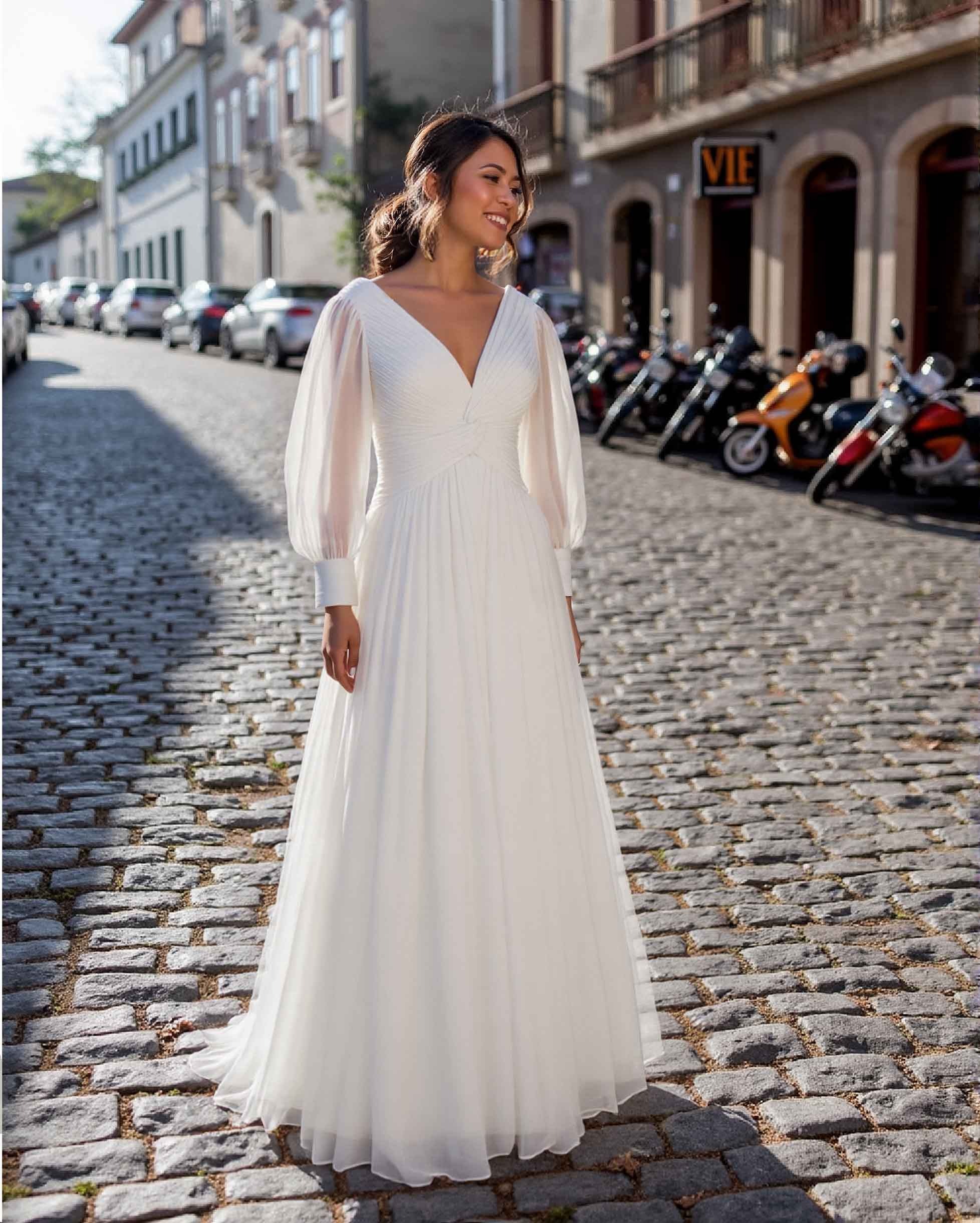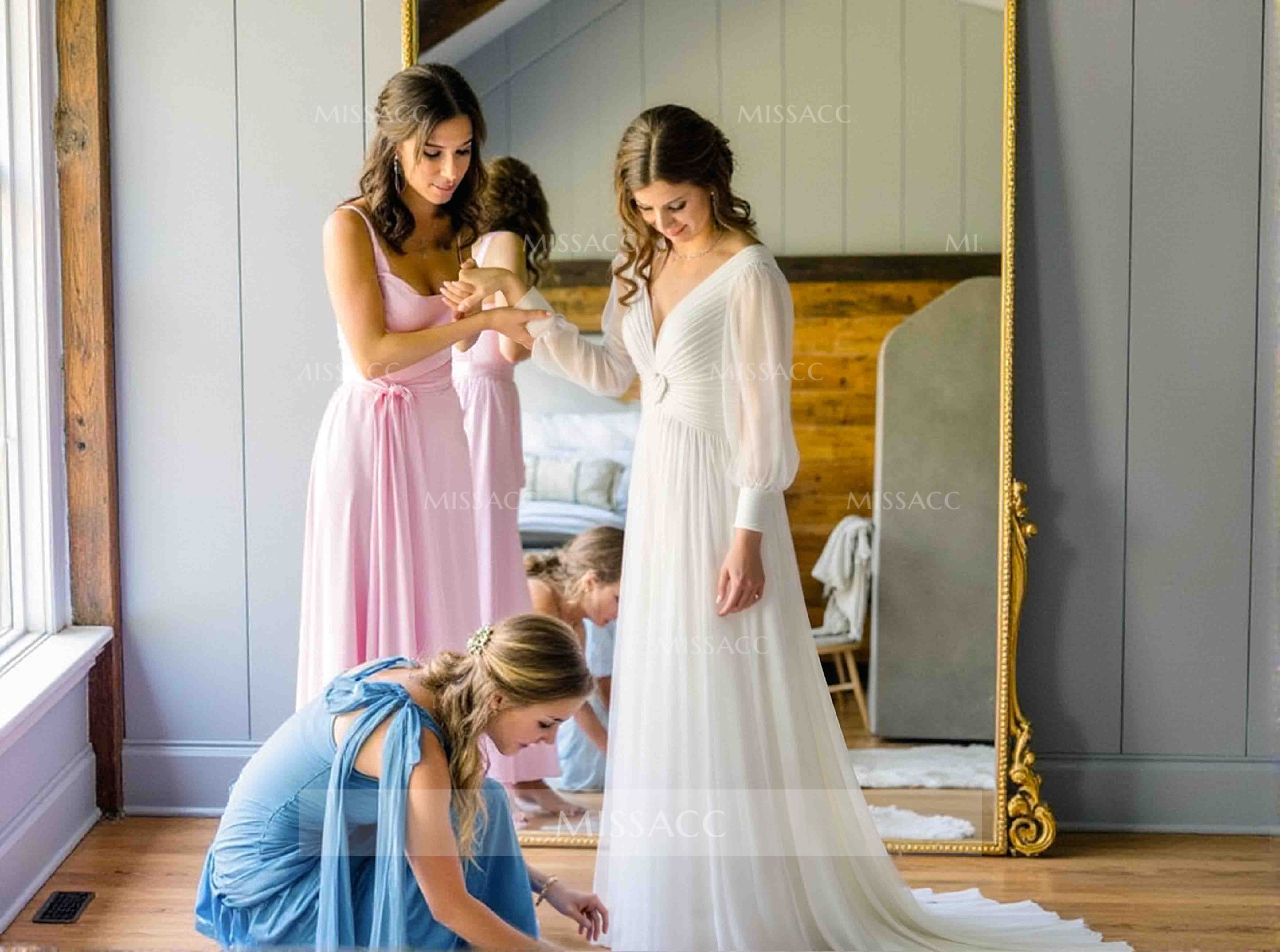 The wedding dress is a graceful a-line design crafted from soft chiffon. It features a crossover pleated bodice adding a touch of romance.The sweep-length train flows elegantly, making this gown perfect for the bride who seeks timeless beauty and understated sophistication on her special day.