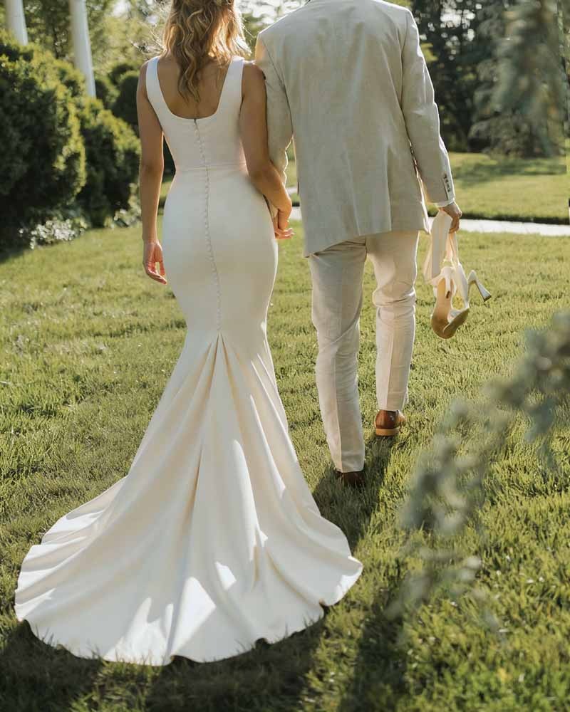 Stunning Boho A-line Lace Wedding Dress with Split Front and Sweep Train, perfect for a chic, romantic ceremony. Crafted from delicate lace, featuring a sleeveless design and a captivating split front.