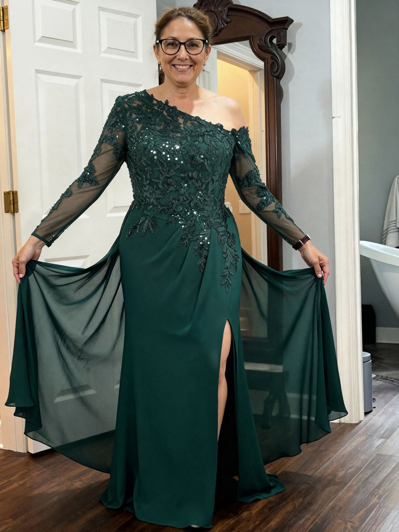 Stunning lace long-sleeve V-neck dress for mother of the bride, crafted with delicate fabric for a special occasion. Timeless elegance for weddings.