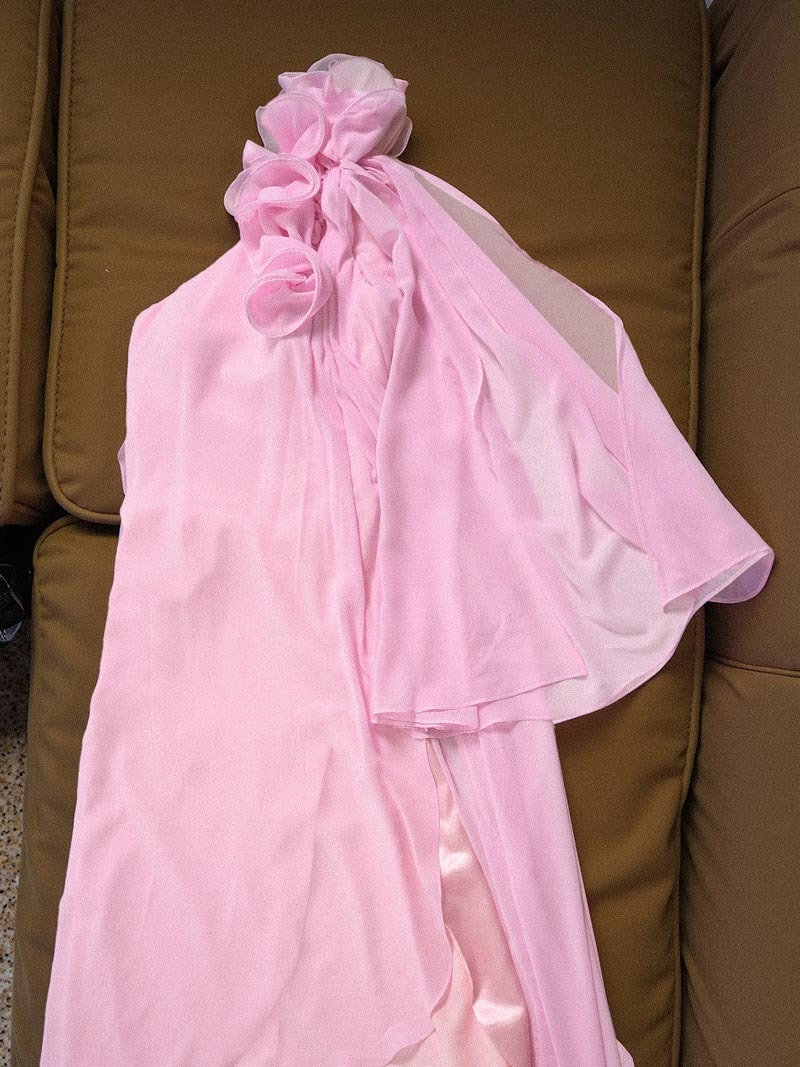 This dress is really beautiful, though I did have to get it slightly hemmed. The one-shoulder design is very striking and makes the dress stand out. The chiffon is soft and moves nicely. It's a solid choice for a special occasion.
