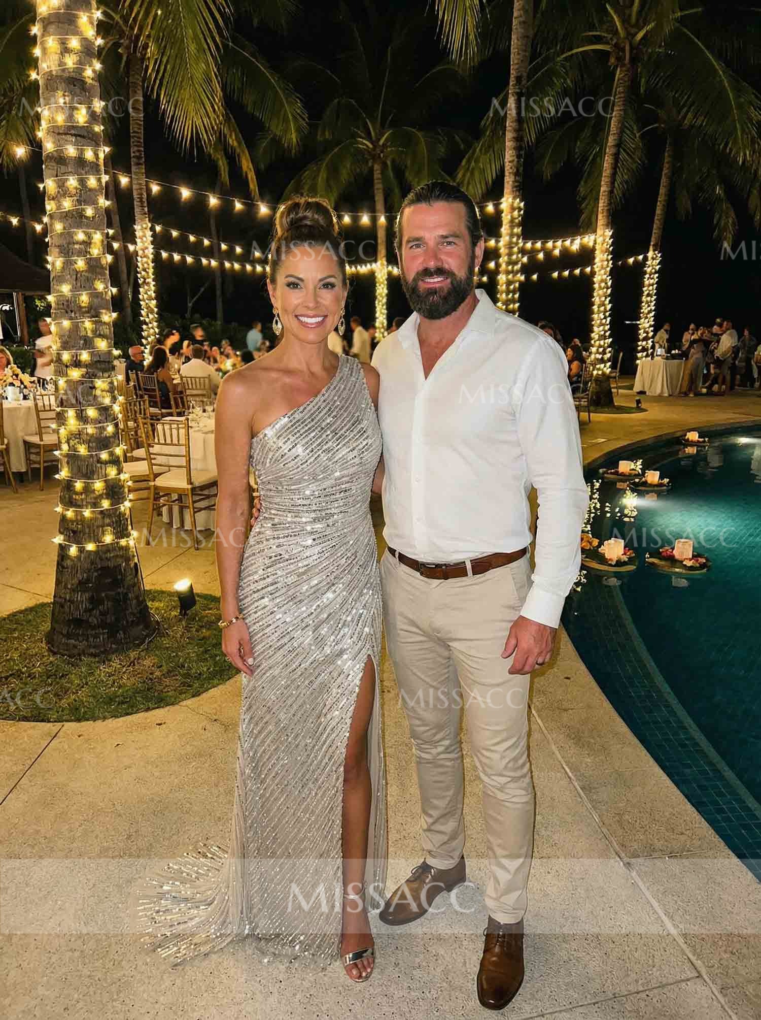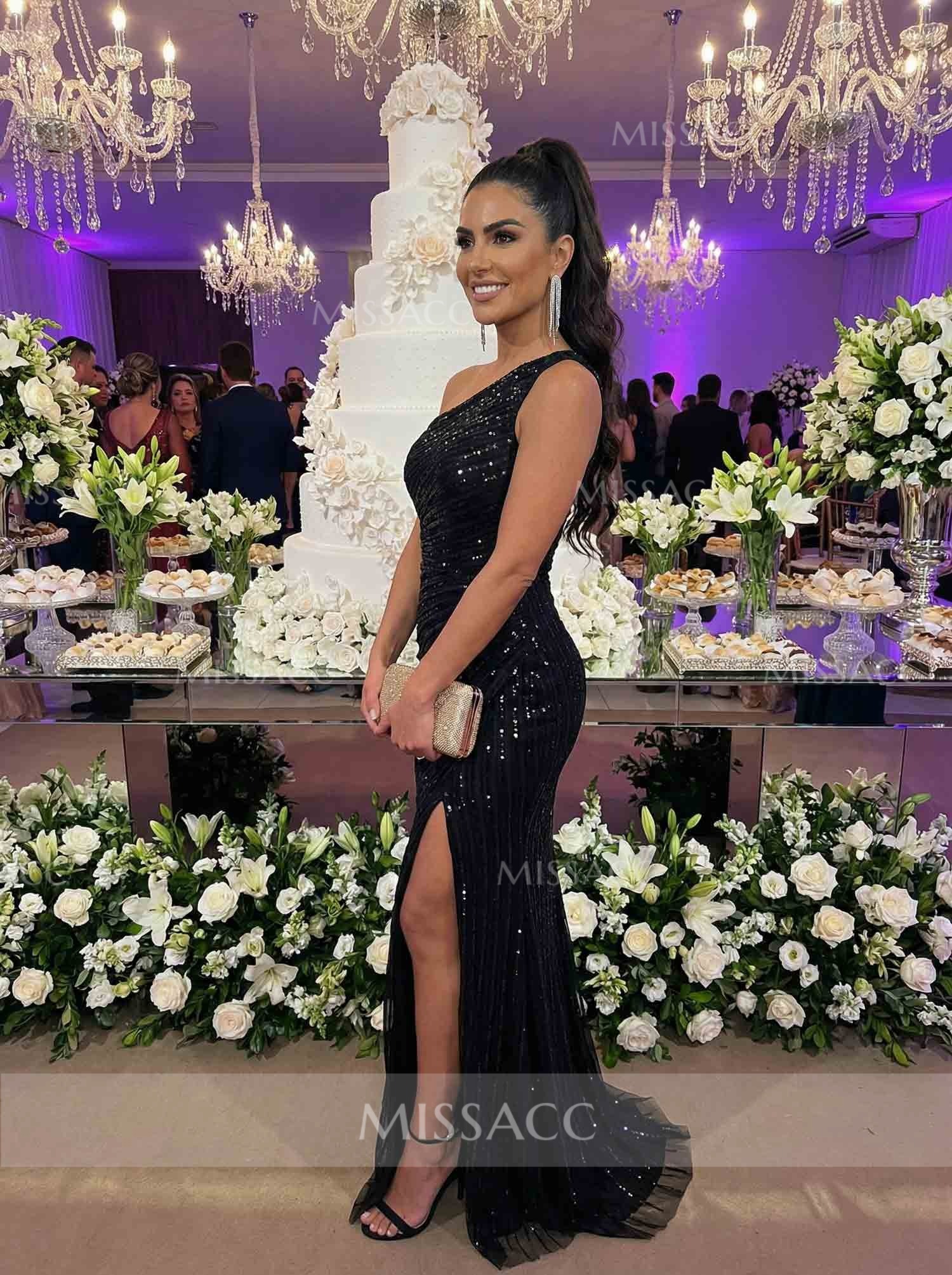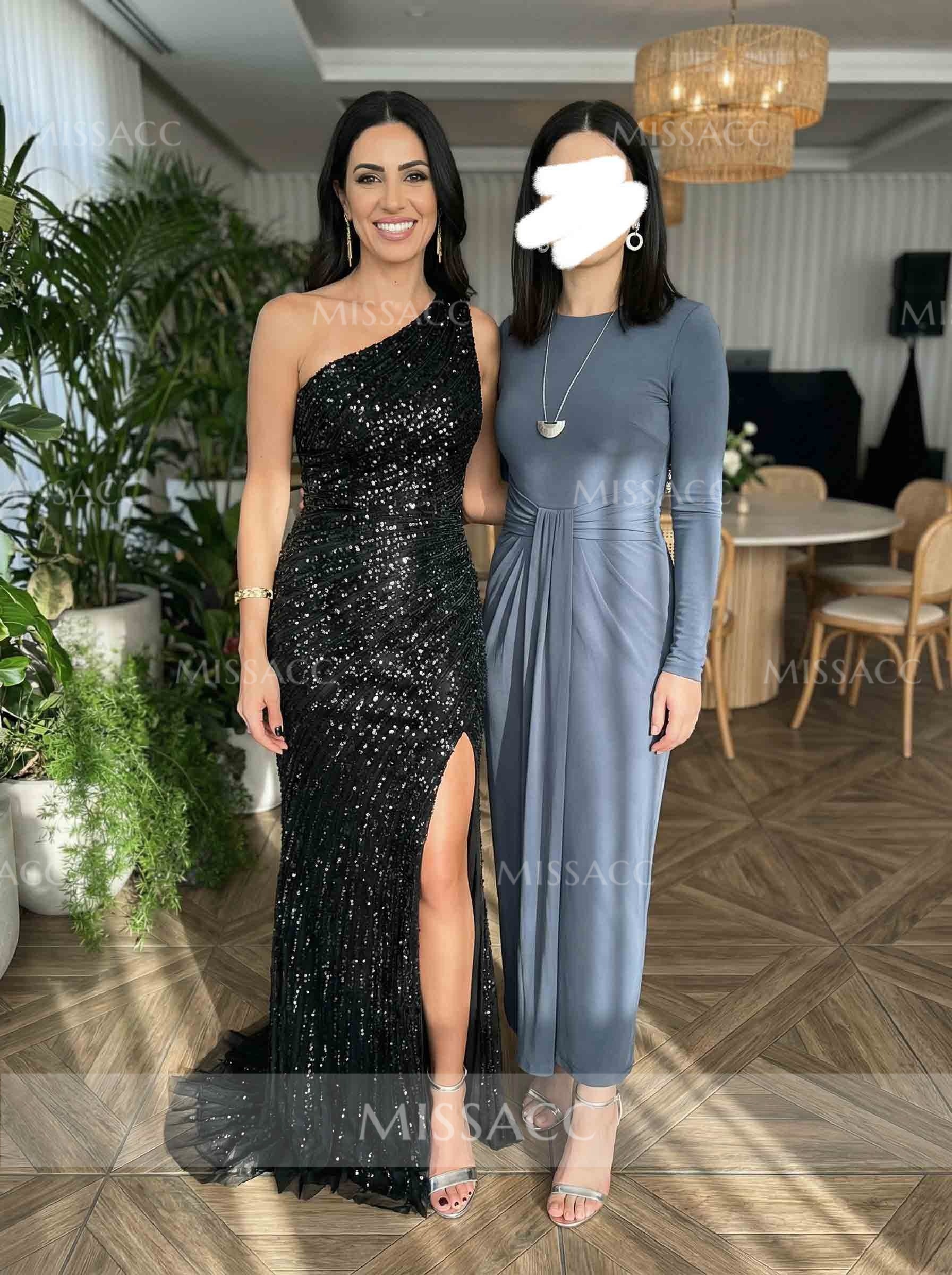 I've never felt so elegant and comfortable in a dress! The one-shoulder design is extremely unique, and the sequins are simply dazzling. The front slit adds a touch of surprise. It's really beautiful, and I love it!
