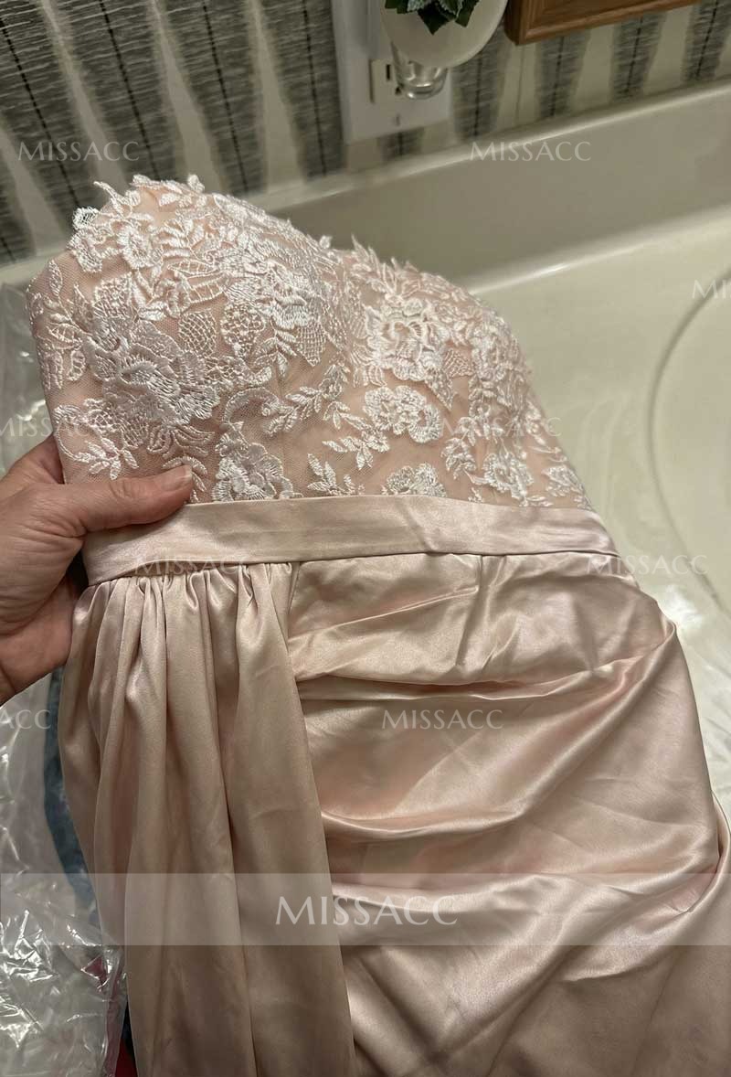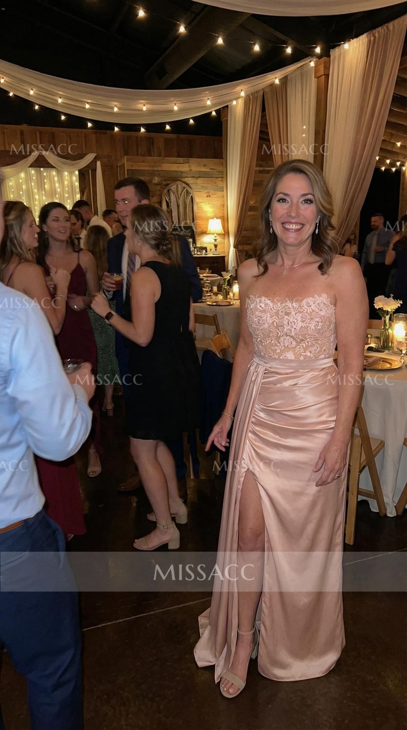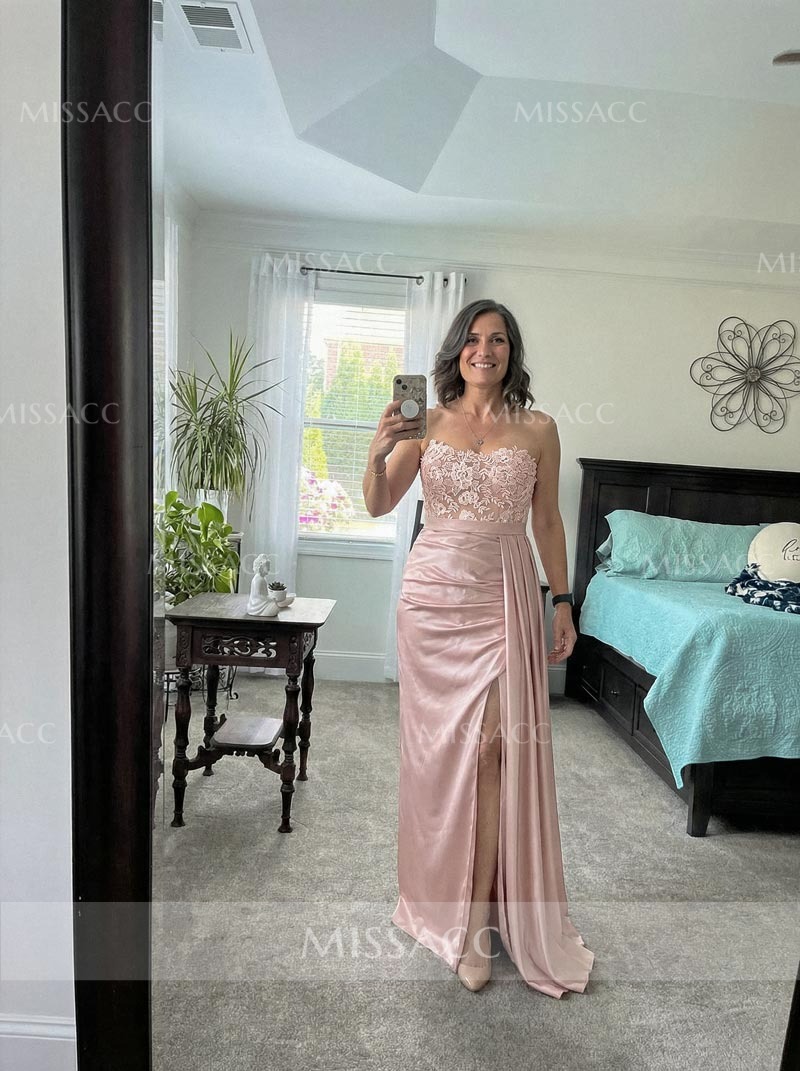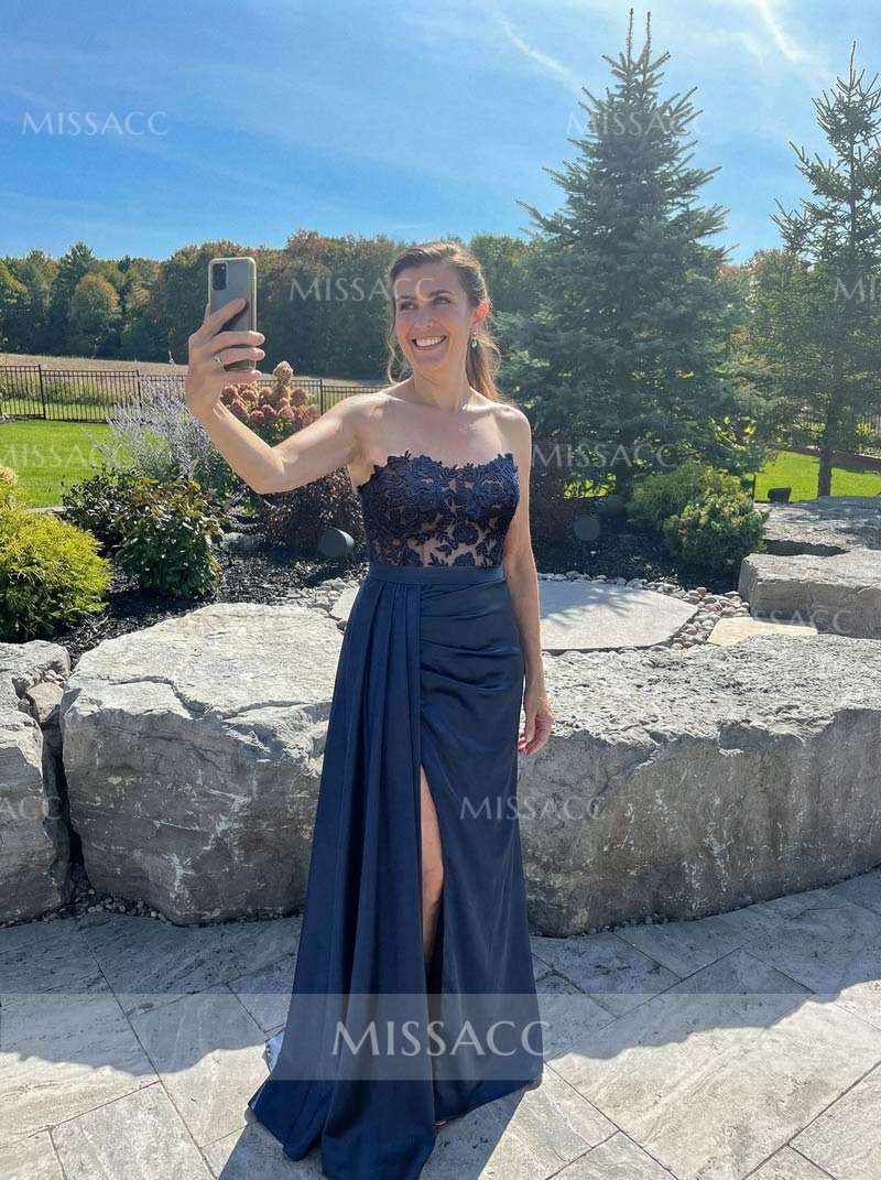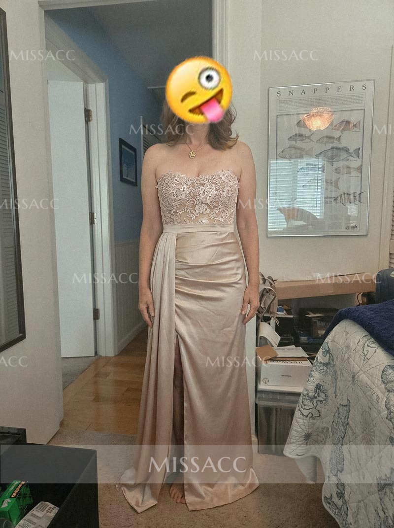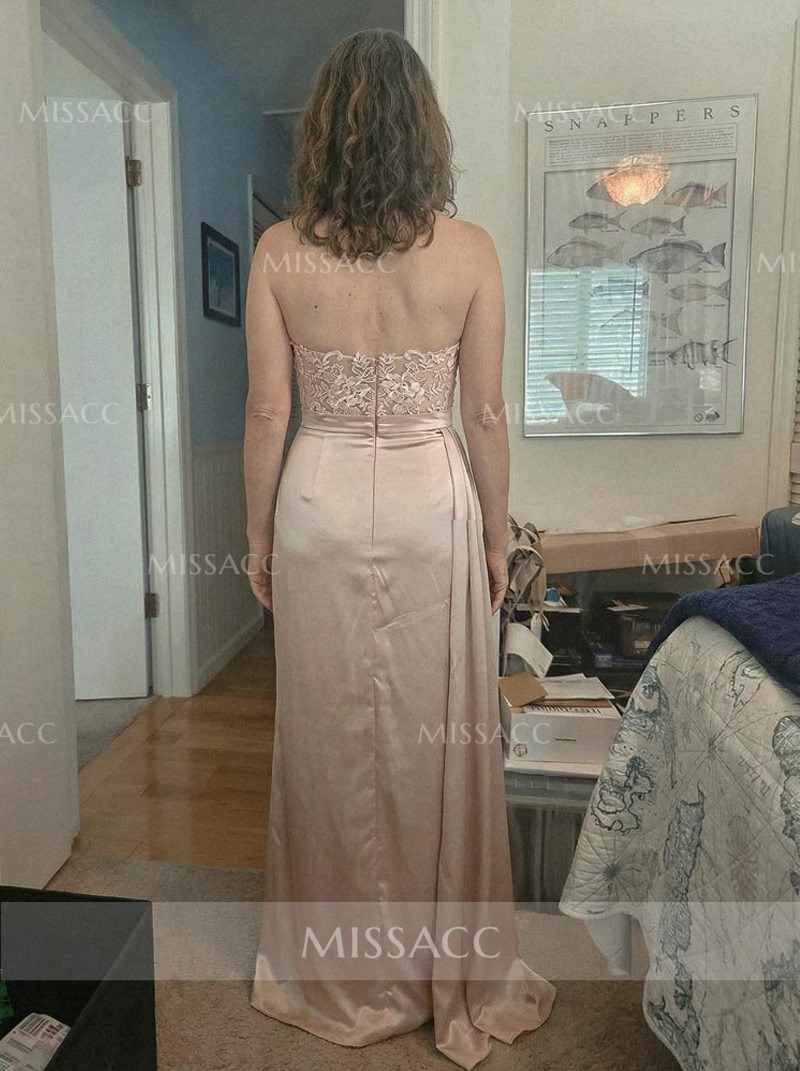 "Silk-like satin floor-length evening dress with lace split front, perfect for special occasions. Sheath column silhouette, sleeveless, and strapless design."