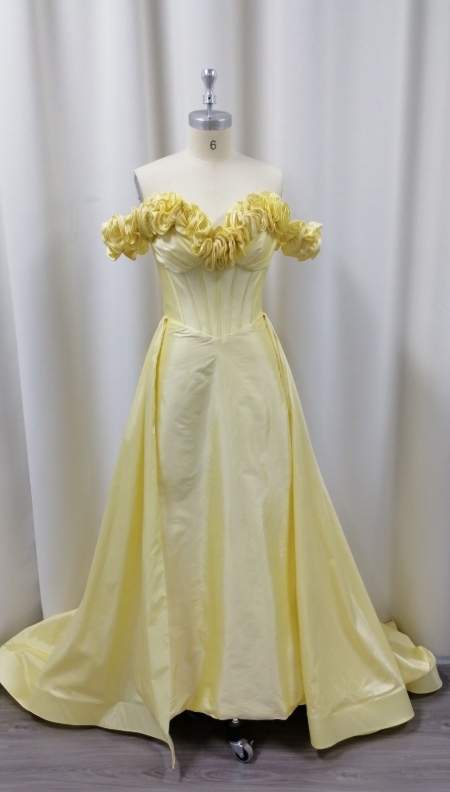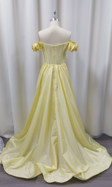 This dress is a nice find. The ruffle flower design is a nice touch and the off-the-shoulder style is very on-trend. It fits well and the sweep train adds a touch of elegance. It's not the most formal dress, but it's great for semi-formal events. Overall, I'm happy with my purchase!